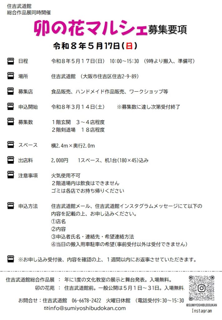 住吉武道館の総合作品展と同時開催の卯の花マルシェの出店者を募集いたします
